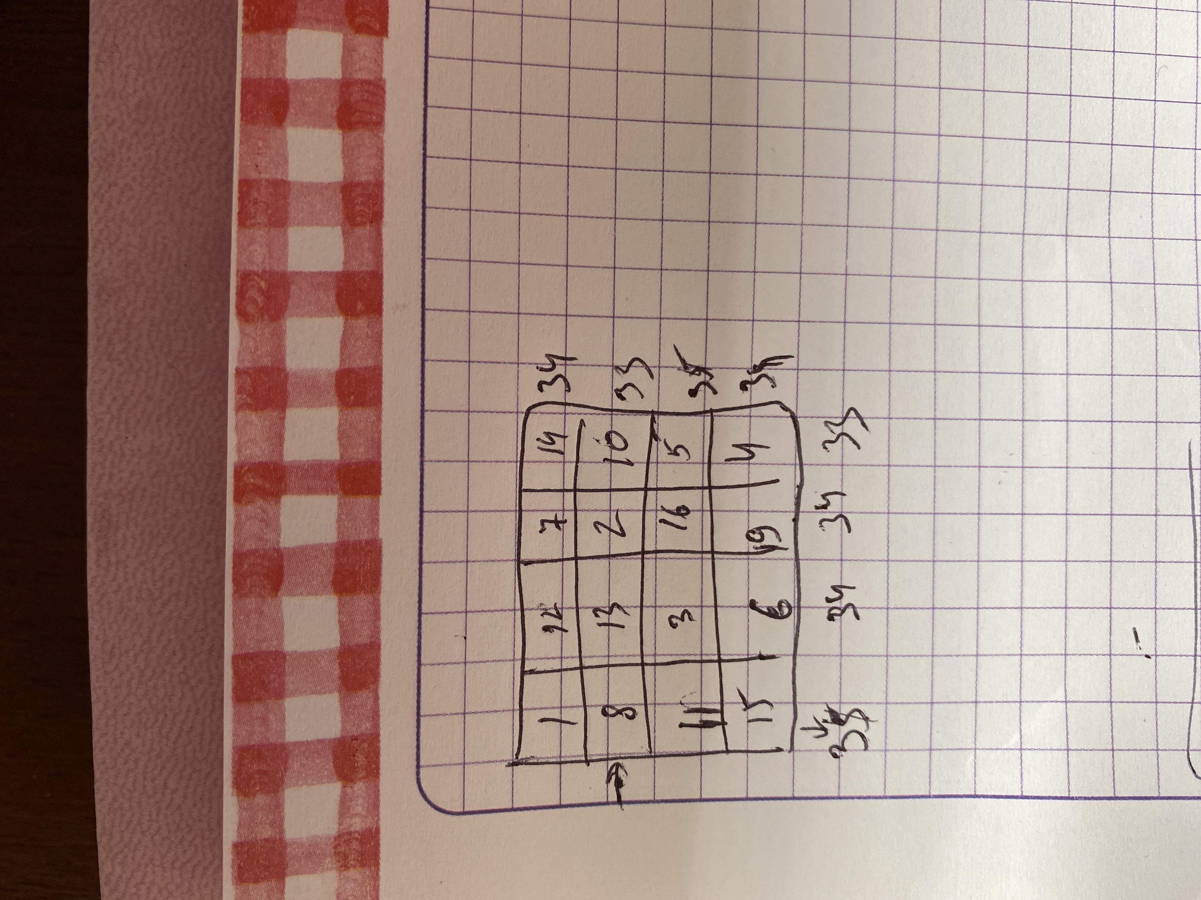 Мистер Пифагор использовал числа от 1 до 16 для построения магического квадрата 4 х 4 так, чтобы суммы четырех чисел в каждой строке и каждом столбце были одинаковые. Но ошибочно мистер Пифагор переставил местами два числа. Его результат показан на рисунке. Чему равна сумма переставленных чисел?