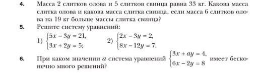 4. Пусть слиток олова - x, а слиток свинца - y. Тогда 2x+5y=53, 6x-y=19.