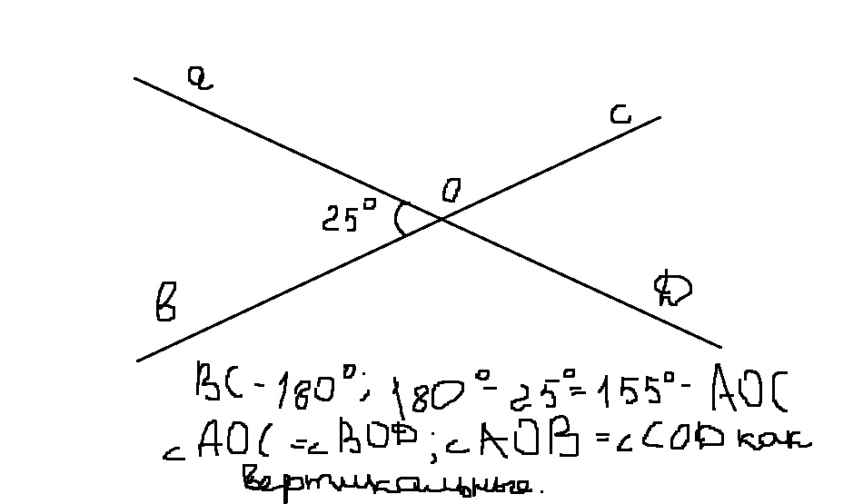 один из углов,образованных двумя пересекающимися прямыми,равен 25 найдите величины остальных углов