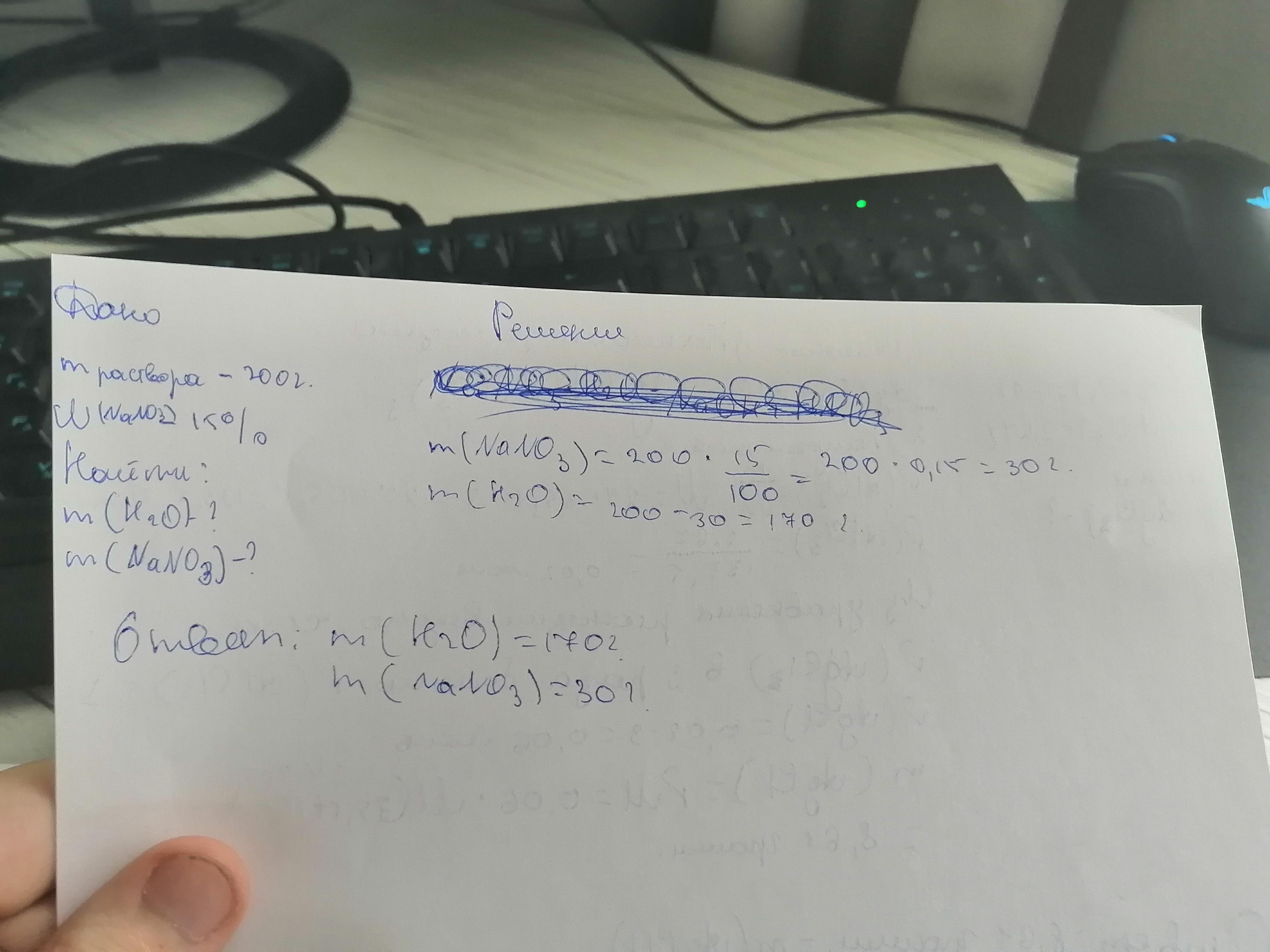 Какие массы воды и нитрата натрия нужно взять для приготовления 200г раствора с массовой долей соли 15 %? (написать ход решений)