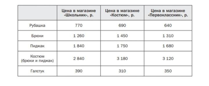 Для первоклассника Коли нужно купить рубашку, брюки, пиджак и галстук в одном из магазинов: «Школьник», «Костюм» или «Первоклассник». Используя данные таблицы, найдите стоимость самой дешёвой покупки. Укажите магазин, в котором нужно сделать эту покупку.