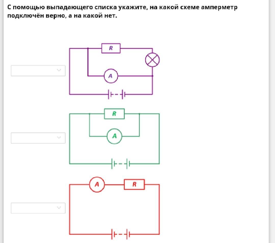 С помощью выпадающего списка укажите, на какой схеме амперметр подключен верно, а на какой нет.