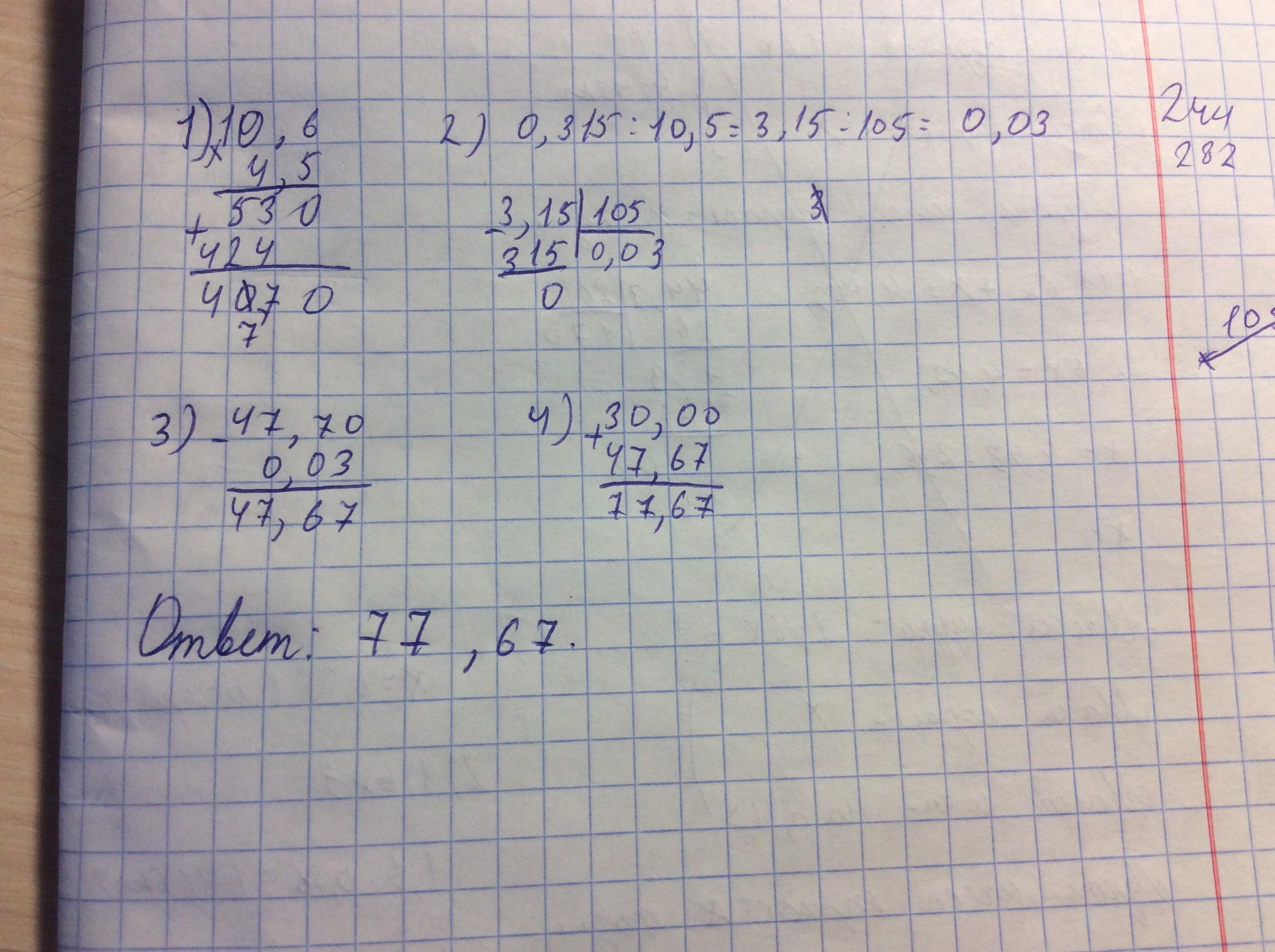 30+(4.5×10.6-0.315:10.5)=30+(47.7-0.03)=30+47.67=77,67