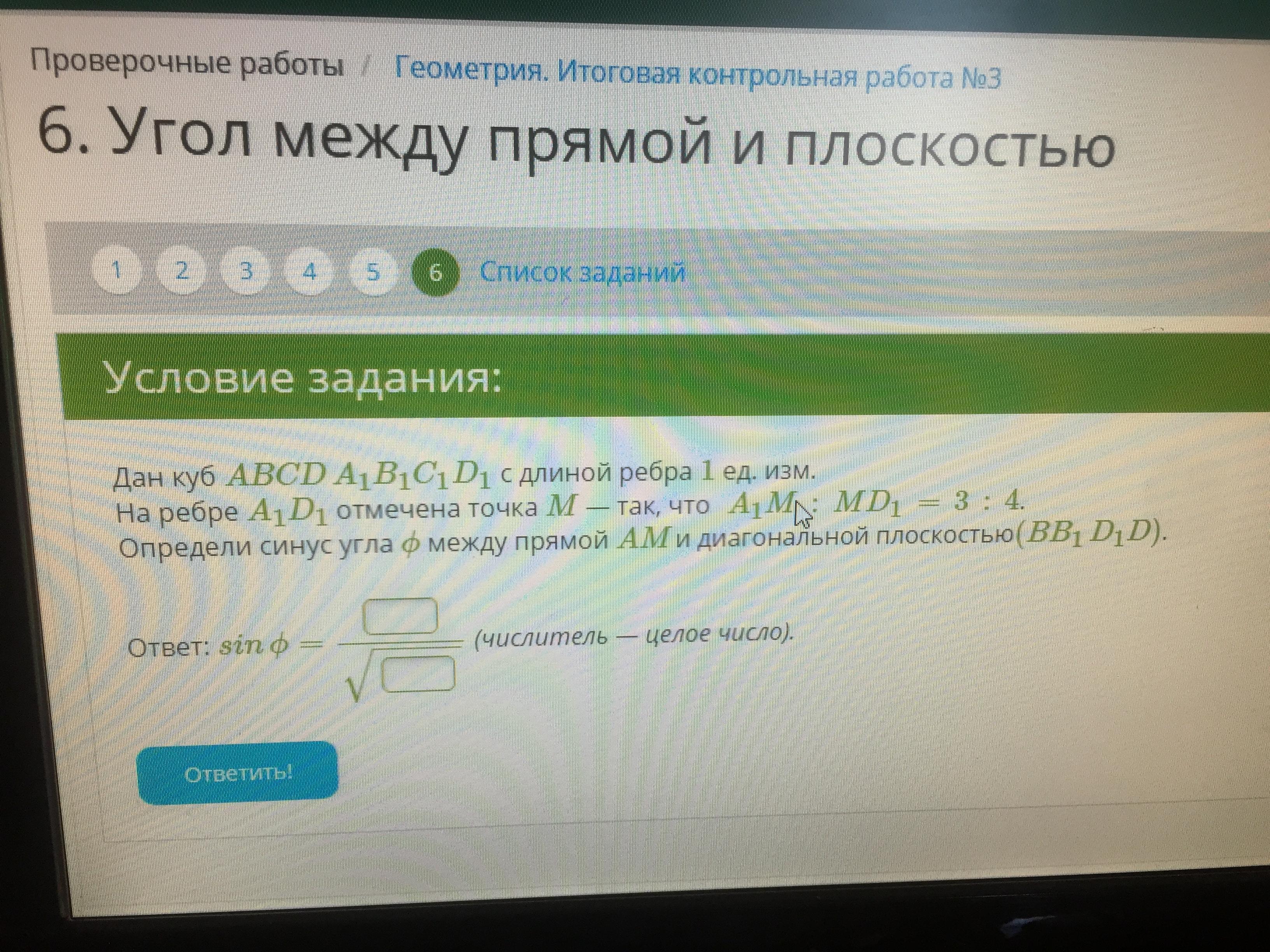 Определи синус угла ϕ между прямой AM и диагональной плоскостью(BB1D1D).