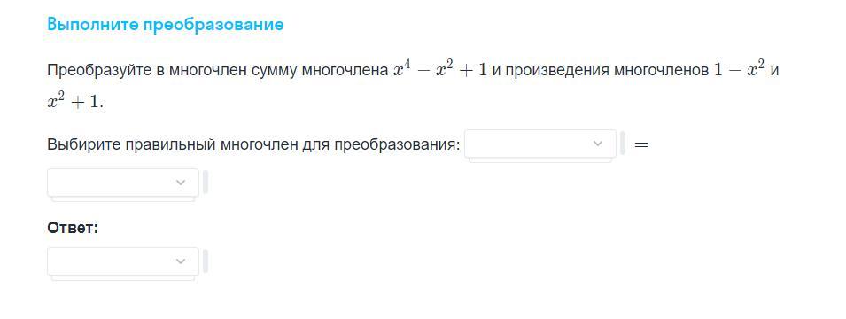 Преобразуйте в многочлен сумму многочлена x^4-x^2+1 и произведения многочленов 1-x^2 и x^2+1.