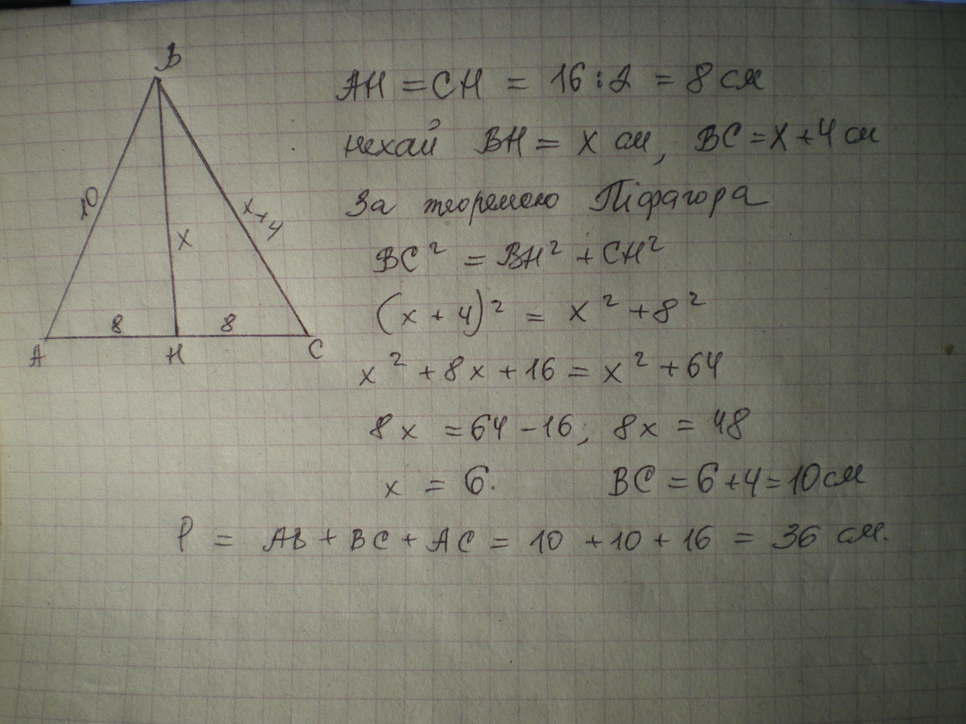 даю 30 балів Знайдіть периметр рівнобедреного трикутника , основа якого дорівнює 16 см , а бічна сторона на 4 см більша за висоту , проведену до основи