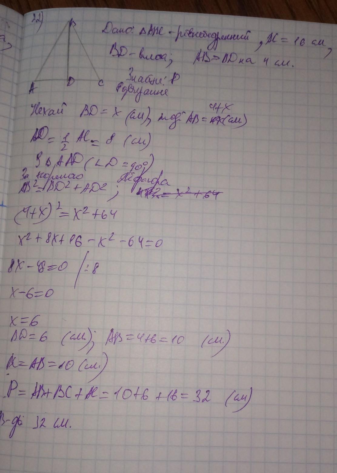 даю 30 балів Знайдіть периметр рівнобедреного трикутника , основа якого дорівнює 16 см , а бічна сторона на 4 см більша за висоту , проведену до основи