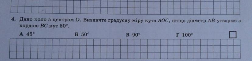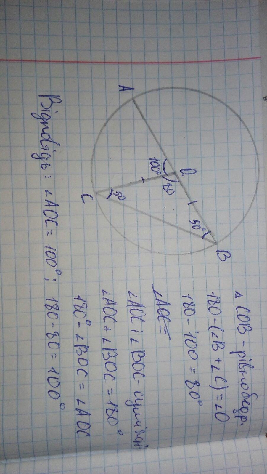 Дано коло з центром О. Визначте градусна міру кута AOC, якщо діаметр AB утворює з хордою BC кут 50°.