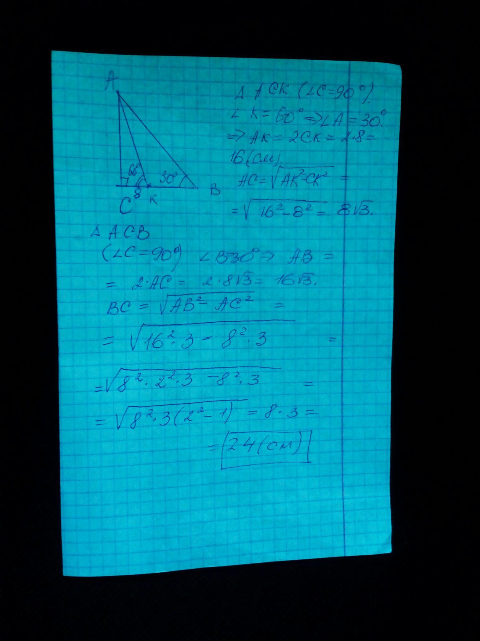 В ΔАСК ∠К= 60°, ∠ С =90°, тогда ∠ А=30° , значит, против угла в 30° лежит катет СК=8, равный половине гипотенузы АК, а АК=16, В ΔАКВ ∠АКВ=180°-30°=120°, по свойству смежных углов, ∠КАВ=30°, но тогда боковые стороны АК=КВ=16см и СВ=СК+КВ=8+16=24/см./