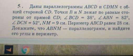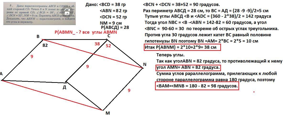 Даны параллелограммы ABCD и CDMN с об- щей стороной CD. Точки В и N лежат по разные стороны от прямой CD; = 38°, 82°, DCN = 52°, NM = 9 см. Периметр ABCD равен 28 см. Докажите, что ABCD - параллелограмм, и найдите его углы и периметр.