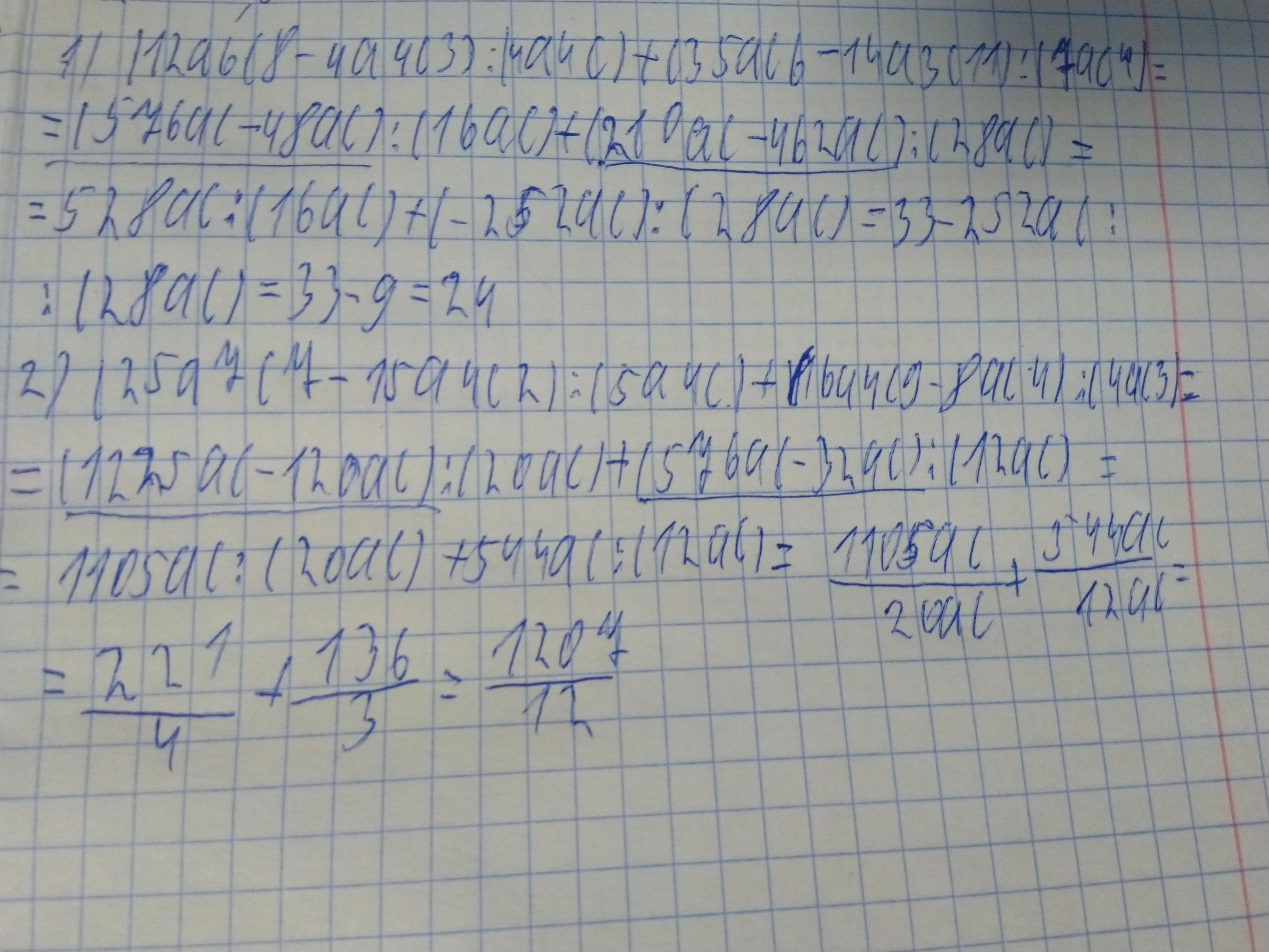 Выполните действия: 1) (12а6с8 – 4а4с3): (4 а4с) + (35ас6 – 14а3с11):(7ас4); 2) (25а7с7 – 15а4с2): (5 а4с) + (16а4с9 – 8ас4):(4ас3).