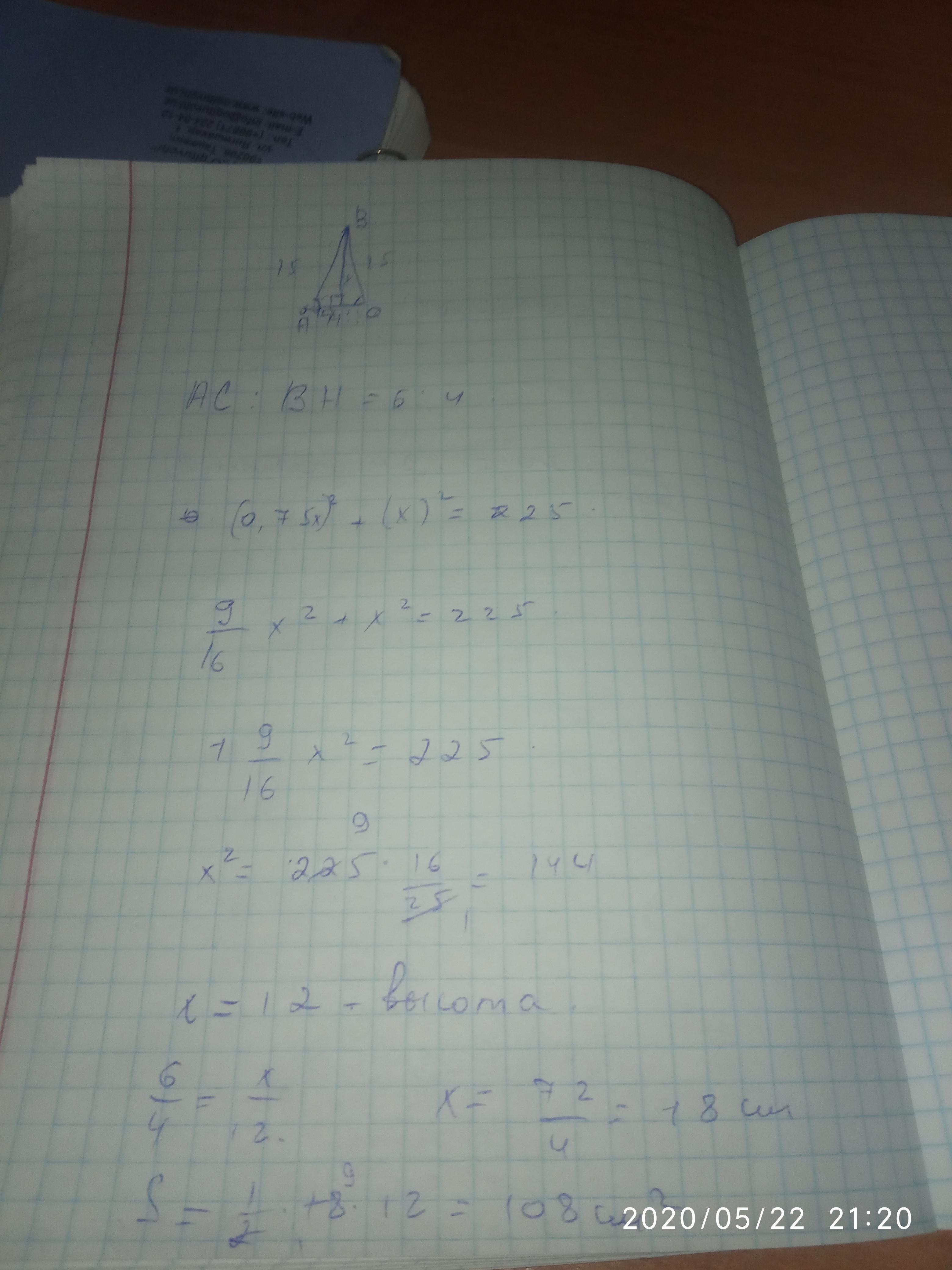 В равнобедренном треугольнике Боковая сторона равна 15 см, основание относится к высоте проведенной к ней как 6:4. Найдите площадь треугольника.