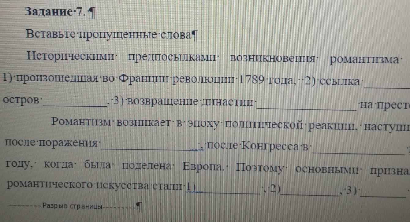 Ответ: 2) Ссылка Наполеона 1 на остров Святой Елены. 3) Бурбонов. 4) Франции. 5) В Вене в 1815 году. 6) Культ чувств, природы и естественного состояния человека. Отрицание рационализма, культа разума и упорядоченности. - Существование «двух миров»: мира идеала, мечты и мира действительности.