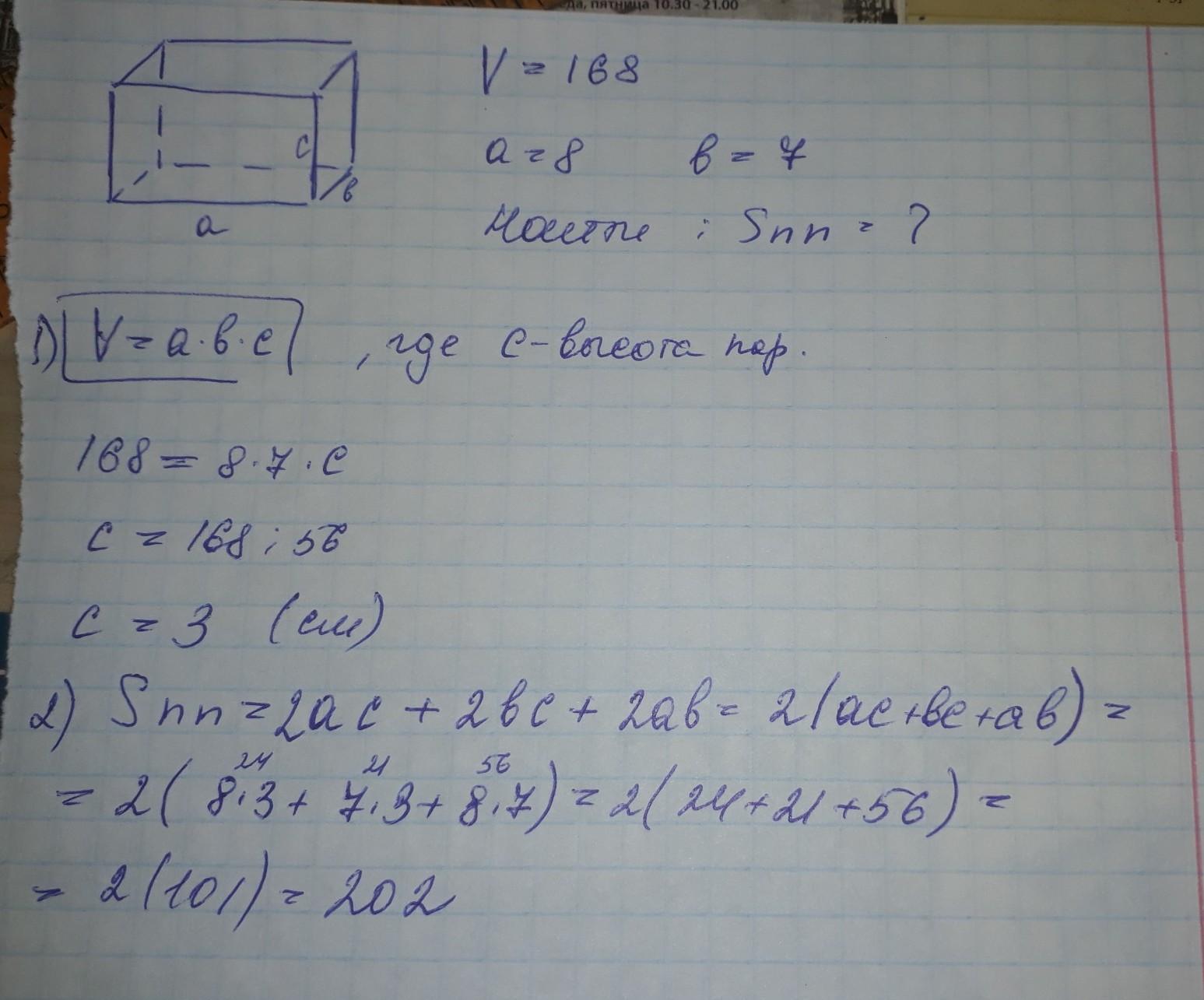Объём прямоугольного параллелепипеда равен 168, две стороны, исходящие из одной и той же вершины, равны a=8, b=7. Найди площадь полной поверхности параллелепипеда