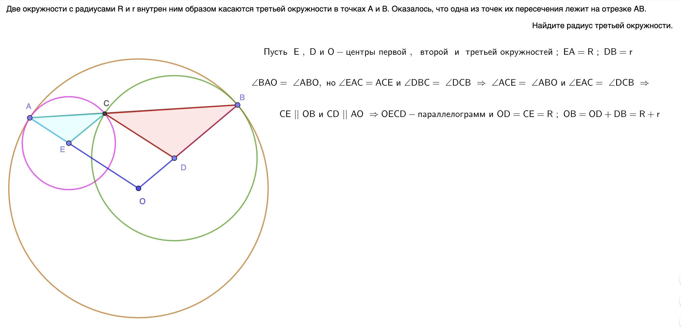 Две окружности c радиусами R и r внутрен ним образом касаются третьей окружности в точках А и В. Оказалось, что одна из точек их пересечения лежит на отрезке АВ. Найдите радиус третьей окружности.