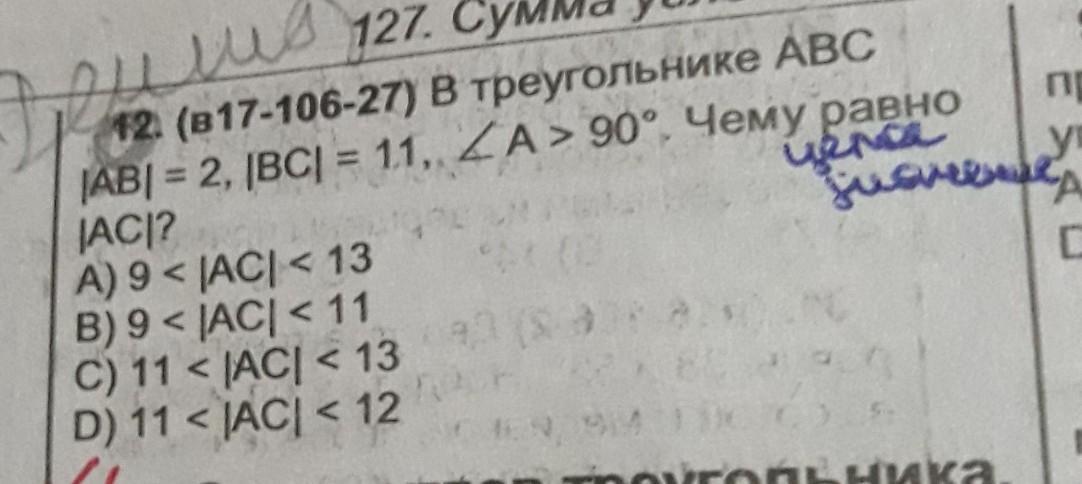 |AC|²=|BC|²-|AB|²=121-4=117. Заметим, что не существует целого числа, равного в квадрате 117, поэтому, как и требуется в задаче (ведь в ответе и приведены возможные интервалы), найдем, между какими целыми числами находится корень из 117. Поскольку 10²=100<117<11²=121, делаем вывод, что длина AC находится между 10 и 11. Такой ответ не приведен в задаче, однако есть другой устраивающий нас ответ, идущий на втором месте: между 9 и 11. Кстати, и первый ответ также подходит - между 9 и 13. Но от 9 до 11 - это более точный ответ, поэтому остановимся на нём.