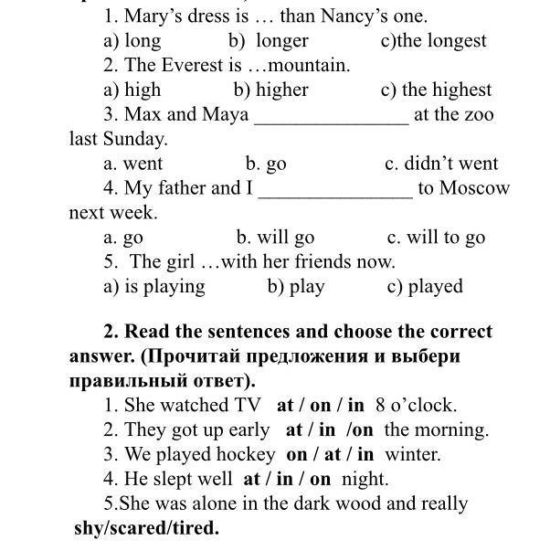 2) 1 - at , 2 - in, 3 - in, - 4 - at, 5 - scared
