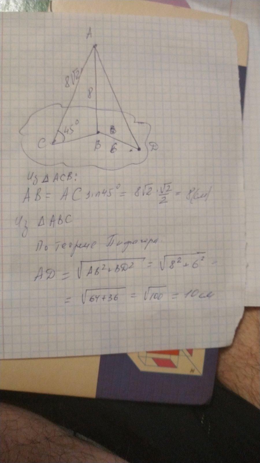 наклонные АС и АД. Угол между наклонной АС и плоскостью равен 450