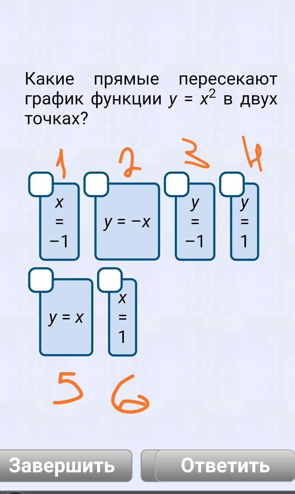 у=1 это прямая ║ оси ох и проходящая через т. (0;1), пересекает параболу в точках (-1;1) и (1;1)