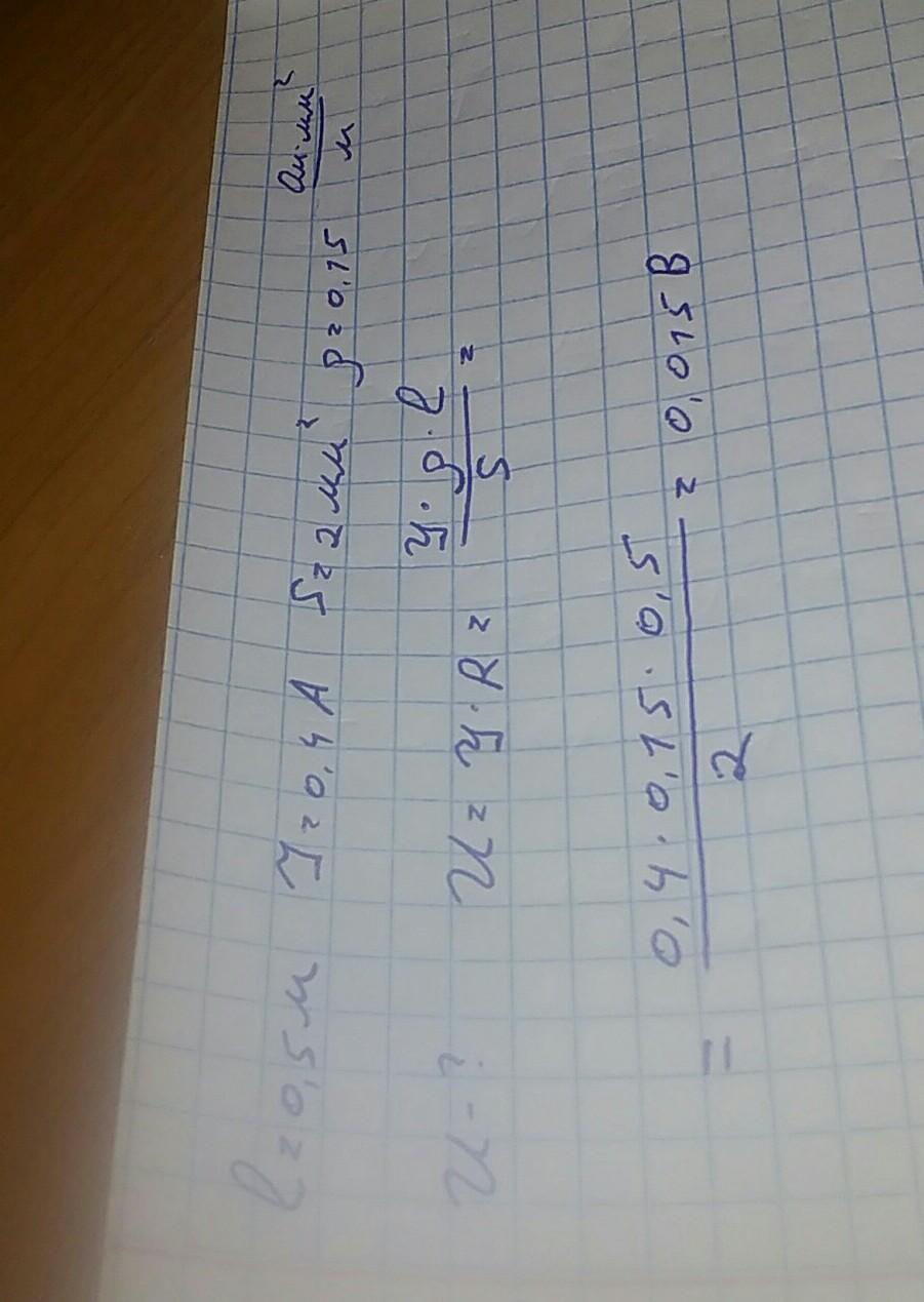 В стальном проводнике длиной 50 см сила тока равна 400 мА, площадь поперечного сечения провода 2 мм2, удельное сопротивление стали 0.15 Ом∙мм2/м. Найти напряжение на концах проводника.