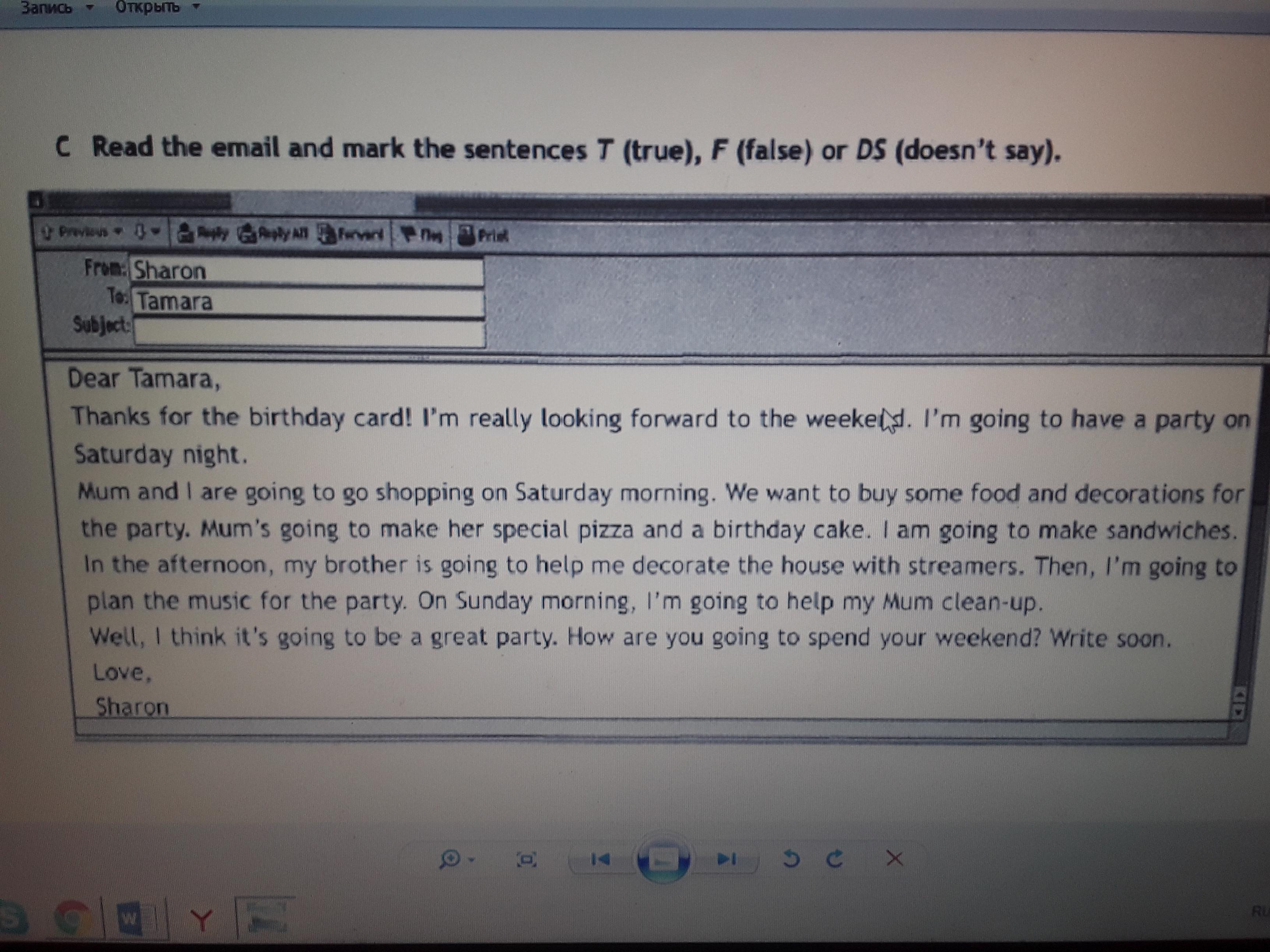 Read the email and mark the sentences True (T), False (F) or Doesn't Say (DS)