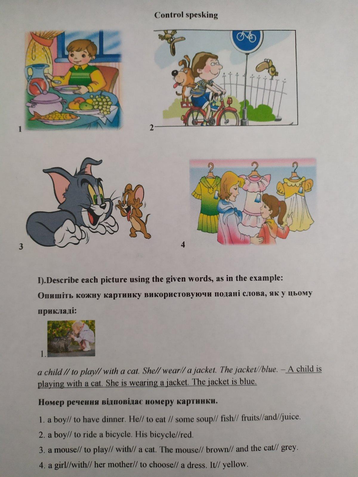 1. A boy has dinner. He eats some soup, one fish, fruits and drinks juice.