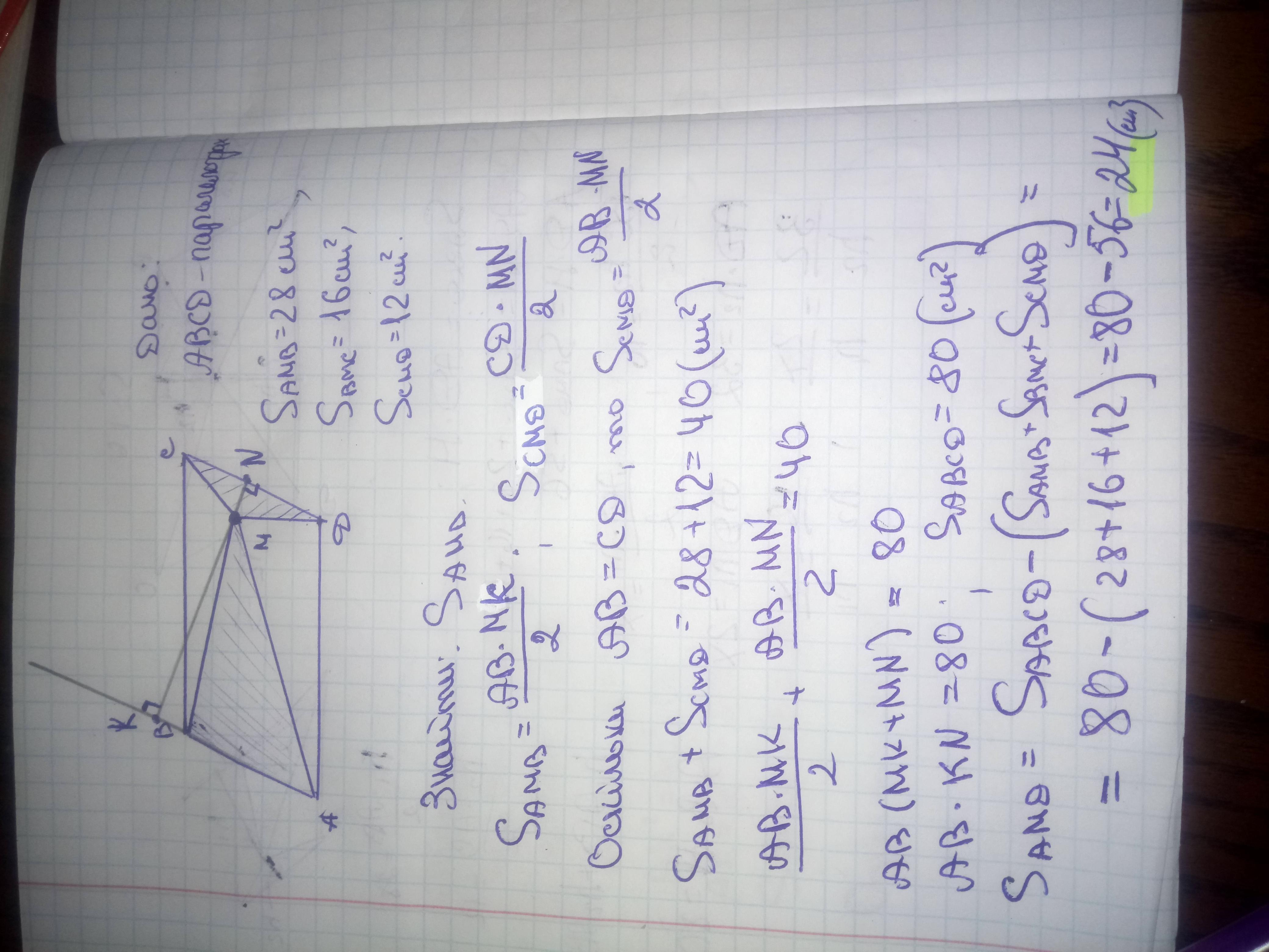 Точка M належить паралелограму ABCD. Відомо, що площі трикутників AMB, BMC і CMD відповідно дорівнюють 28 см², 16 см² і 12 см². Знайдіть площу трикутника AMD. Пожалуйста решите надо ОЧЕНЬ СРОЧНО!!!!!