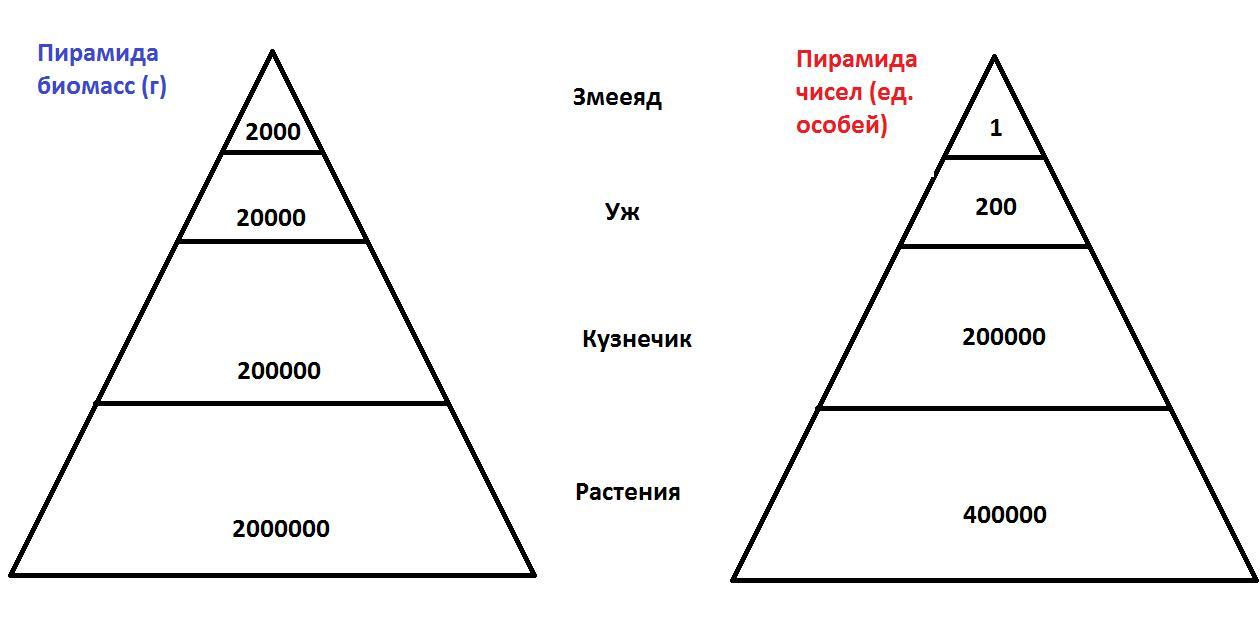 Чтобы 200 ужей "прокормить", им нужна биомасса 200000 г (составив пирамиду биомасс, мы это узнаём), питаются они кузнечиками, т.е им нужно: