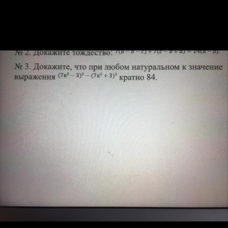Пошаговое объяснение: (7k²-3)² - (7k²+3)²= (7k²-3-7k²-3)(7k²-3+7k²+3)= -6·14k²= - 84k² Выражение делится нацело на 84, значит кратно 84, ч.т.д.