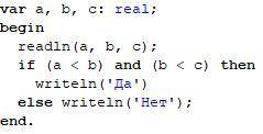Дано три дійсних числа a,b,c . Чи знаходяться вони в порядку збільшеня?