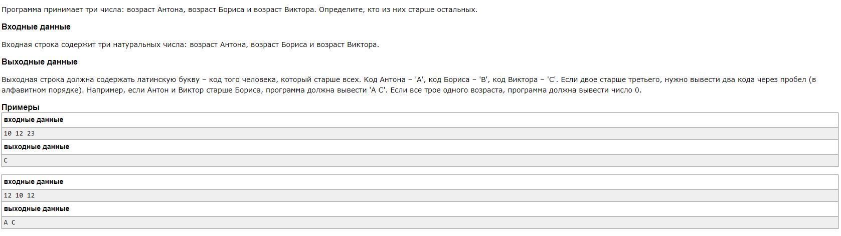 Выходная строка должна содержать латинскую букву – код того человека, который старше всех. Код Антона – 'A', код Бориса – 'B', код Виктора – 'C'. Если двое старше третьего, нужно вывести два кода через пробел (в алфавитном порядке). Например, если Антон и Виктор старше Бориса, программа должна вывести 'A C'. Если все трое одного возраста, программа должна вывести число 0.