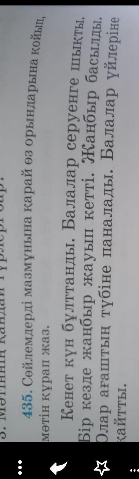 Балалар серуенге шықты.Кенет күн бұлттанды.Бір кезде жаңбыр жауып кетті.Олар ағаштың түбіне паналады.Жаңбыр басылды.Балалар үйлеріне қайтты.
