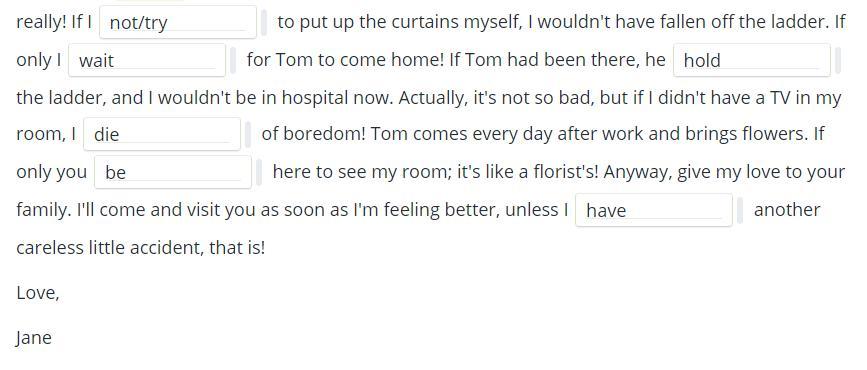 If I hadn’t tried to put up the curtains myself, I wouldn’t have fallen off the ladder. If only I had waited for Tom to come home! If Tom had been there, he would have held the ladder, and I wouldn’t be in hospital now. Actually, it’s not so bad, but if I didn’t have a TV in my room, I would die of boredom! Tom comes every day after work and brings flowers. If only you were here to see my room; it’s like a florist’s! Anyway, give my love to your family. I’ll come and visit you as soon as I’m feeling better, unless I have another careless little accident, that is!