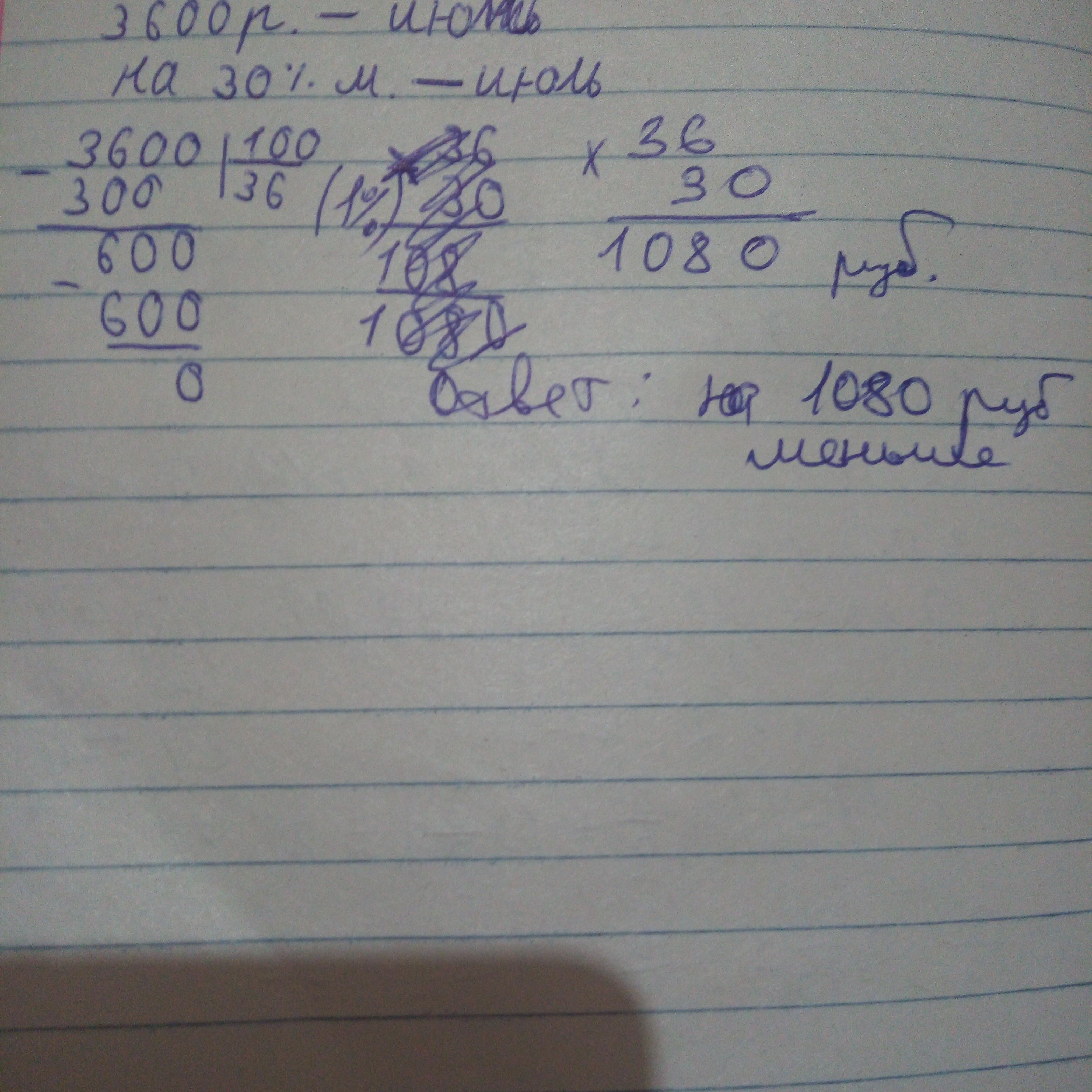 В июне за водоснабжение заплатили 3600 руб., а в июле — на 30 % меньше. На сколько рублей меньше заплатили в июле, чем в июне?