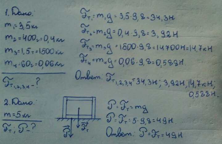 1.Определите силу тяжести,действующую на тело массой 3,5(кг);400(г);1,5(т);60(г).