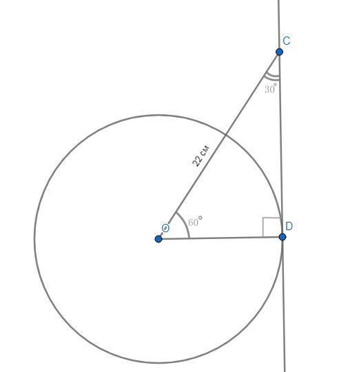 К окружности с центром 0 проведите касательную CD ( D - точка касания ) найти радиус окружности если CO=22 см и угол COD=60°