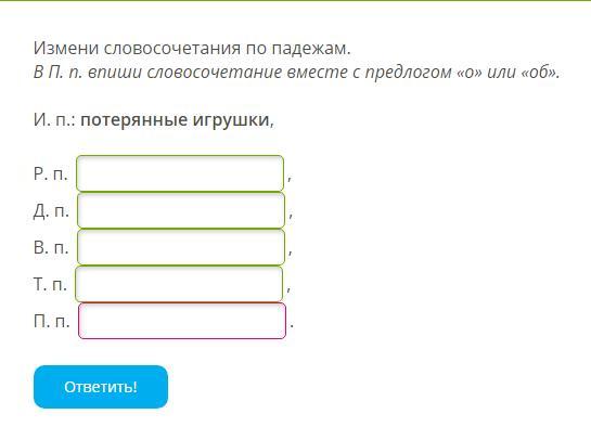 Ответ:2)потерянных игрушек, 3)потерянным игрушкам, 4)потерянные игрушки, 5)потерянными игрушками, 6)о потерянных игрушках
