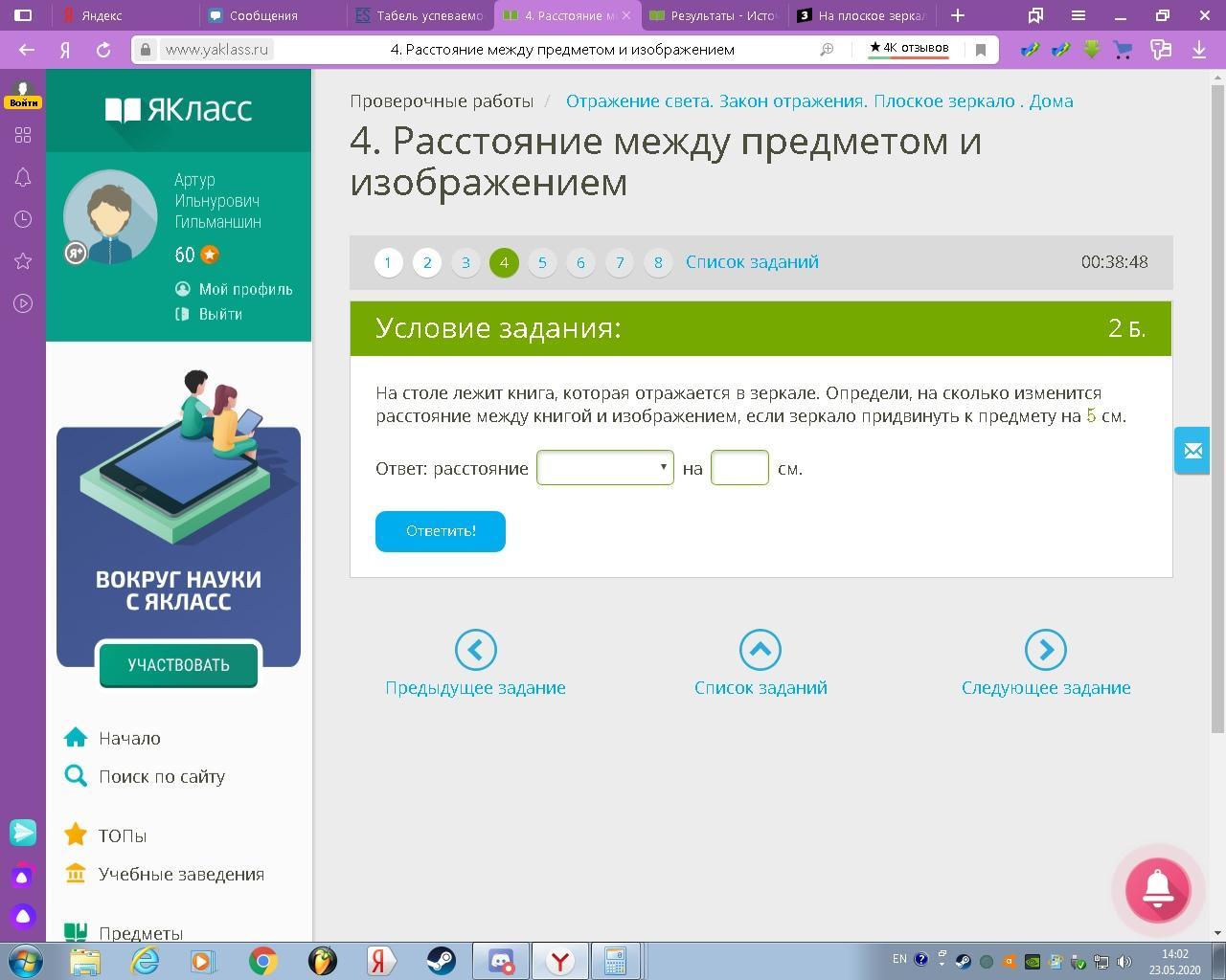 На столе лежит книга, которая отражается в зеркале. Определи, на сколько изменится расстояние между книгой и изображением, если зеркало придвинуть к предмету на 5 см.