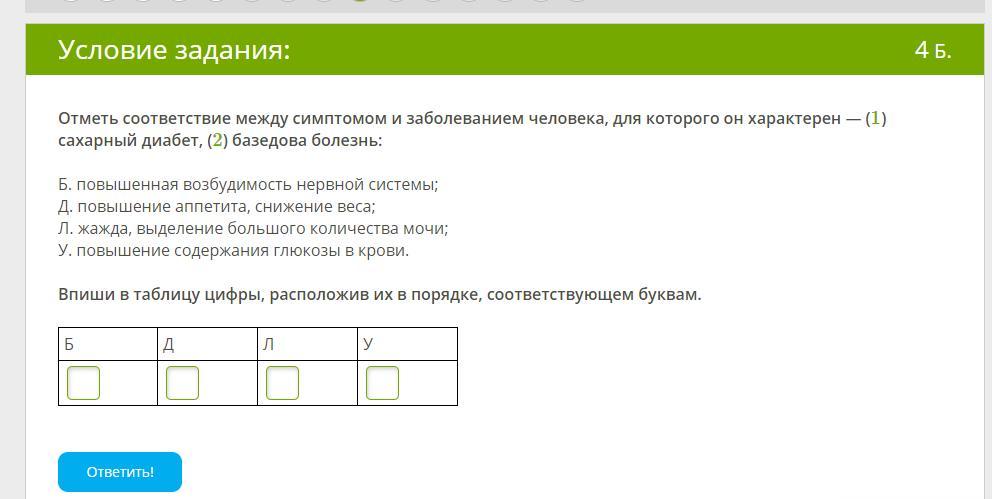Отметь соответствие между симптомом и заболеванием человека, для которого он характерен — (1) сахарный диабет, (2) базедова болезнь: