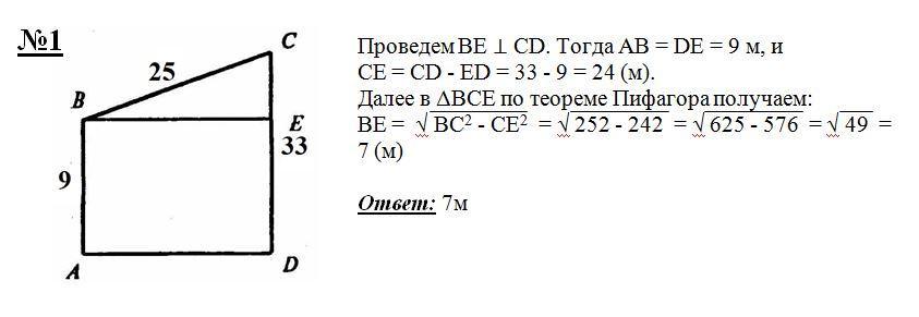 1.Телефонная проволока длиной 25 м протянута от телефонного столба, где она прикреплена на высоте 9 м от поверхности земли, к дому, где ее прикрепили на высоте 33 м. Найдите расстояние между домом и столбом, предполагая, что проволока не провисает.