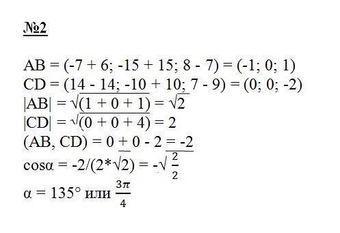 2. Вычислите угол между прямыми АВ и CD, если А (-6; -15; 7), В (-7; -15; 8), С(14; -10; 9) D (14).