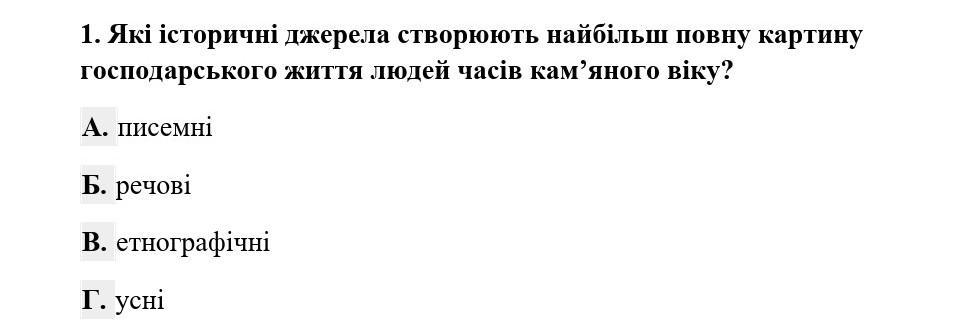 Речові джерела створюють найбільш повну картину господарського життя людей часів кам’яного віку (Б).