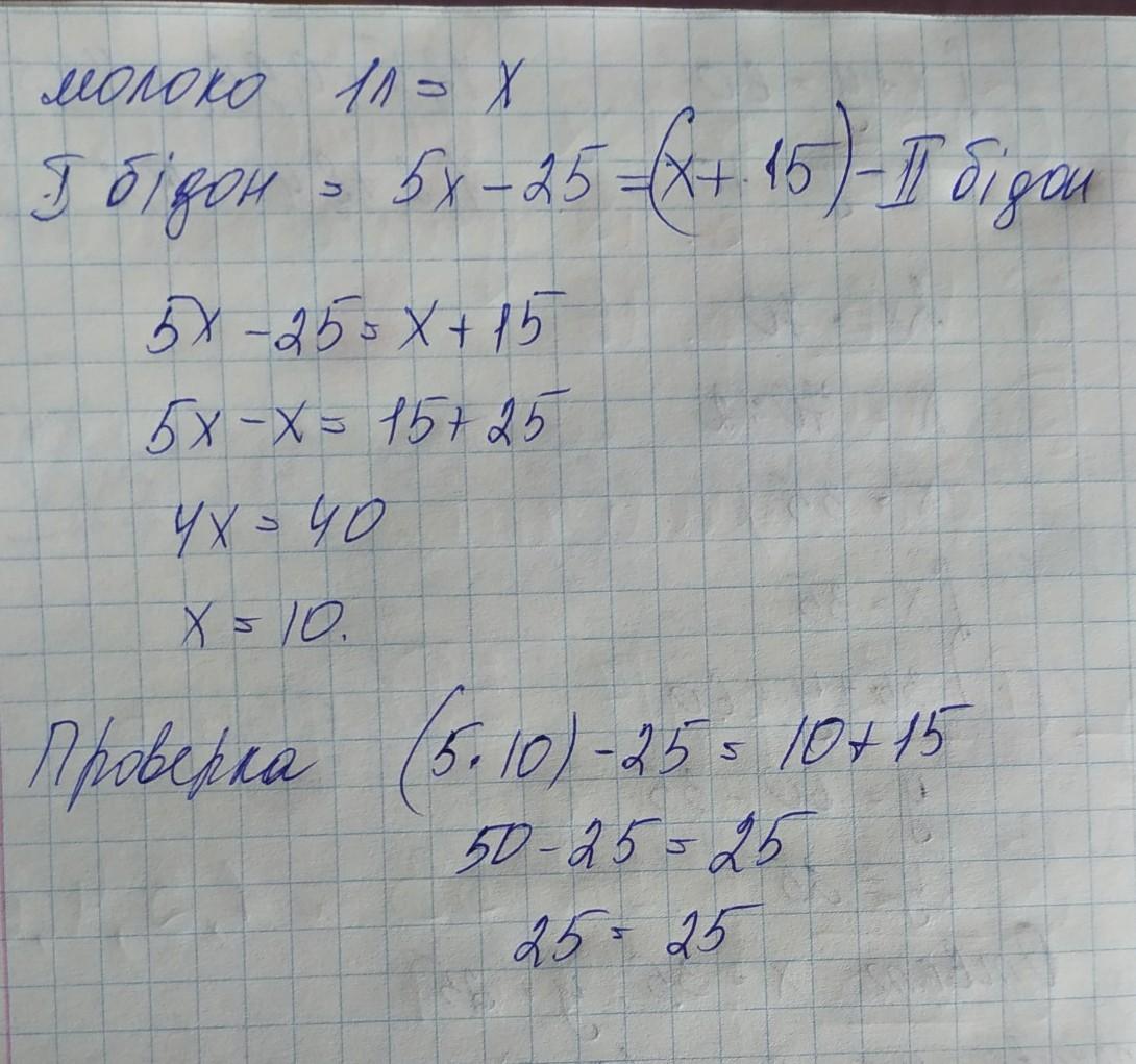 У першому бідоні було в 5 разів більше молока, ніж у другому. Коли з першого бідона відлили 25 л молока, а в другий долили ще 15 л, то в обох бідонах молока стало порівну. Скільки літрів молока було в кожному бідоні спочатку?