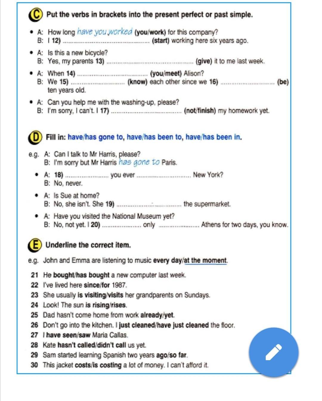 E 21 bought 22since 23visits 24rising 25yet 26have just cleaned 27have seen 28 hasn't called 29 ago 30costs