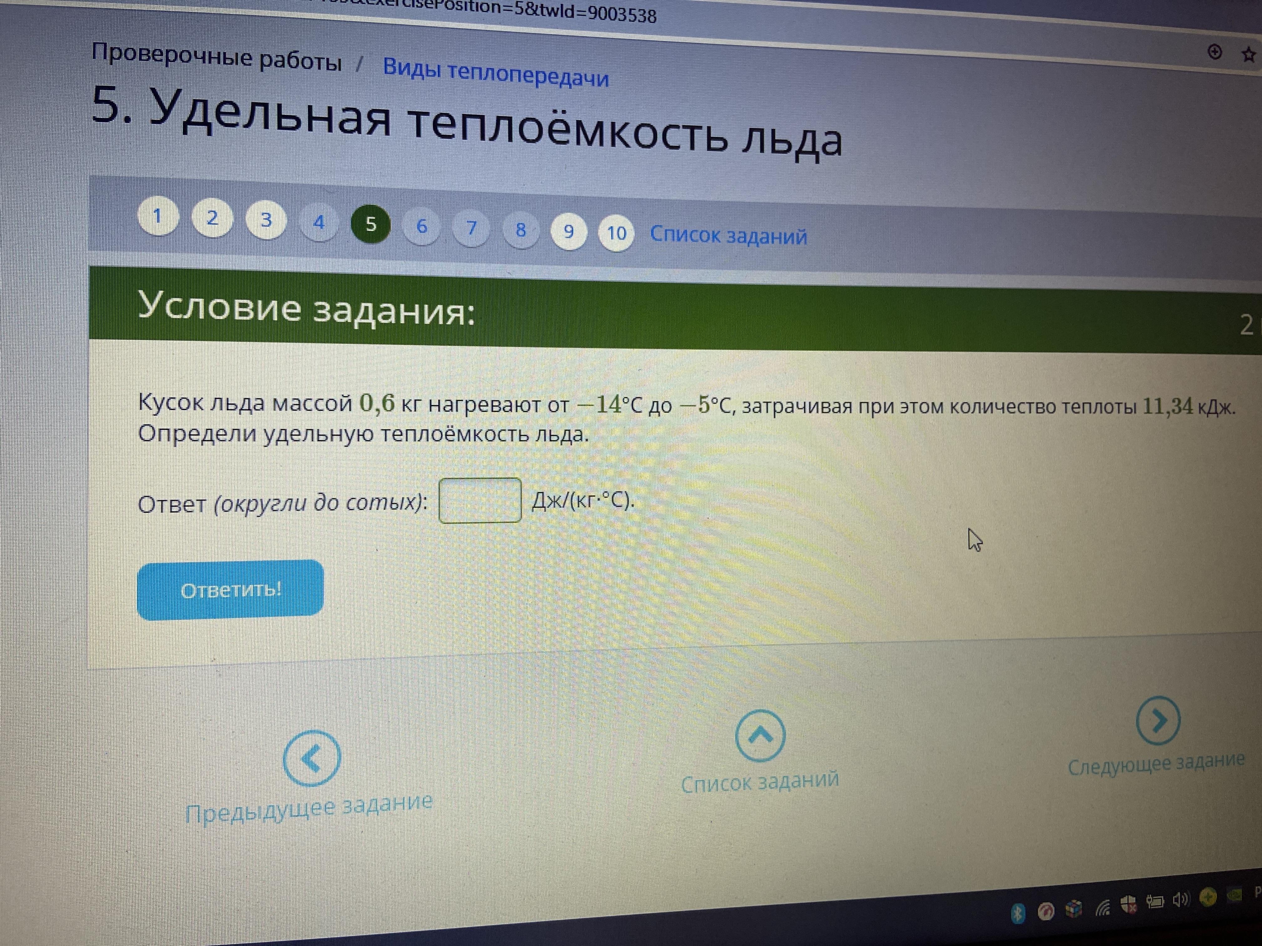 Q=cm(t2-t1) Q=11.34кДж m=0.6 кг t1=-14°C t2=-5°C