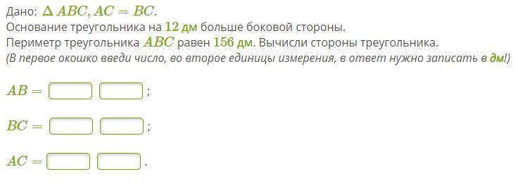 х=48дм -это стороны АС и СВ, а АВ=48+12=60дм,проверка:48+48+60=156дм,что и требовалось доказать