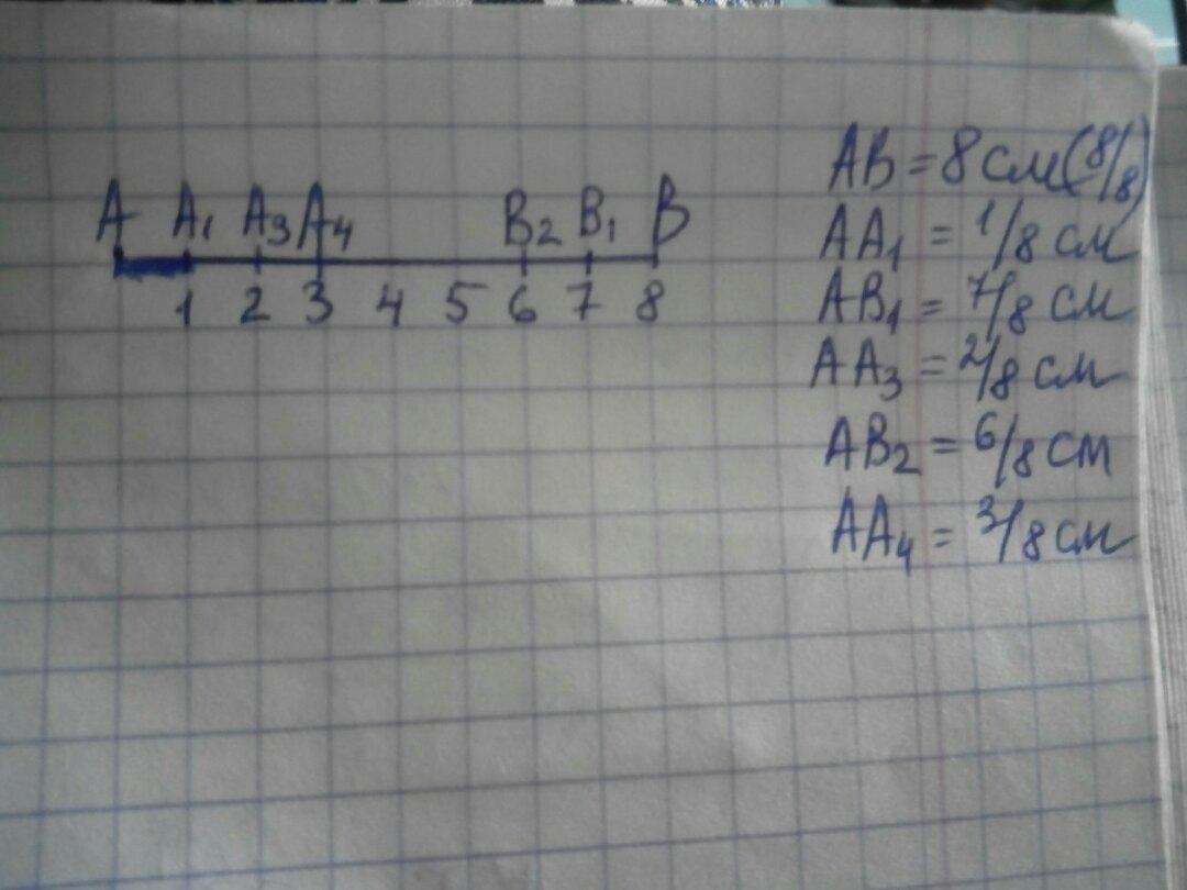 накресли відрізок завдовжки 8 см роздили його на 8 рівних частин покажи на ньому олівцями різних кольорів 1/8,7/8,2/8,6/8,8/8,3/8,