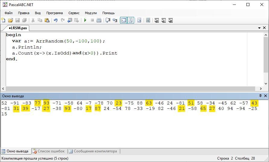 Для нахождения количество положительных нечётных элементов одномерного массива: [массив].Count(x->(x.IsOdd)and(x>0))