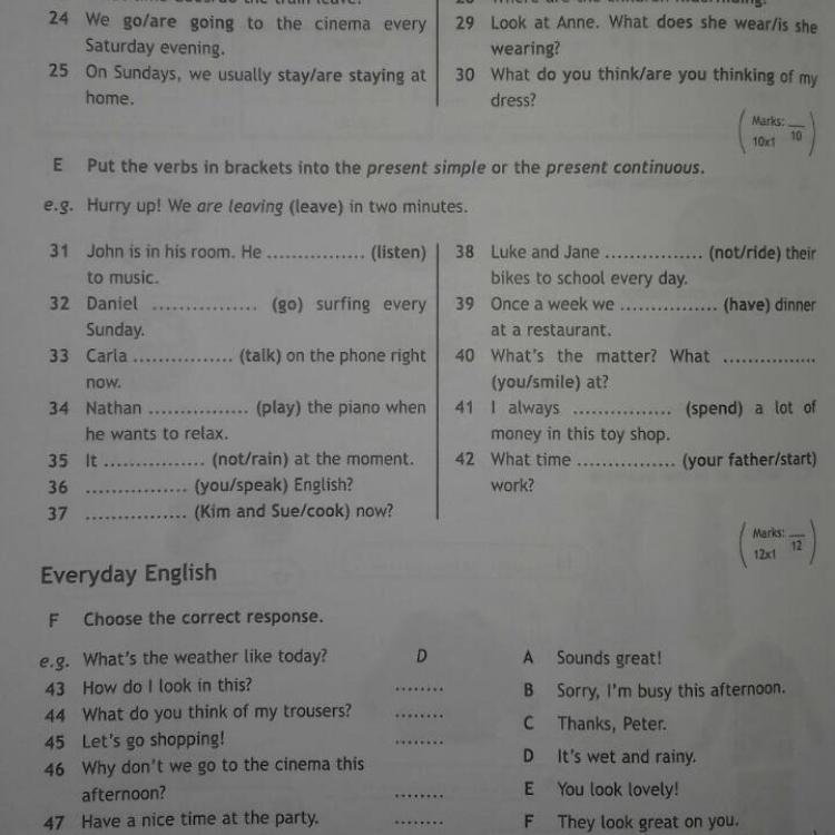 Ответ: Е. is listening, goes, is talking, plays, do you speak English, are Kim and Sue cooking now, don't ride, have? , are you smiling, spend? , does your father start.