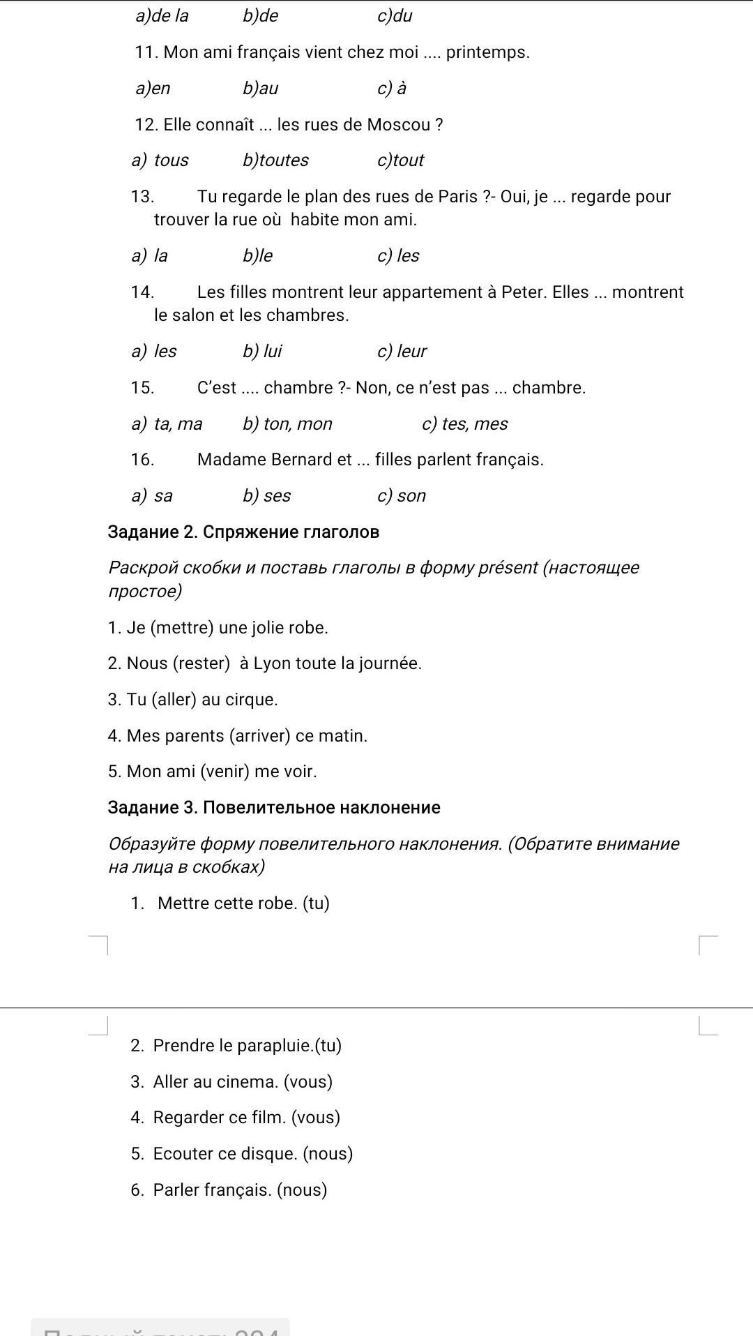 1. Mets cette robe 2. Prends le parapluie 3. Allez au cinéma 4. Regardez ce film 5. Écoutons ce disque 6. Parlons français